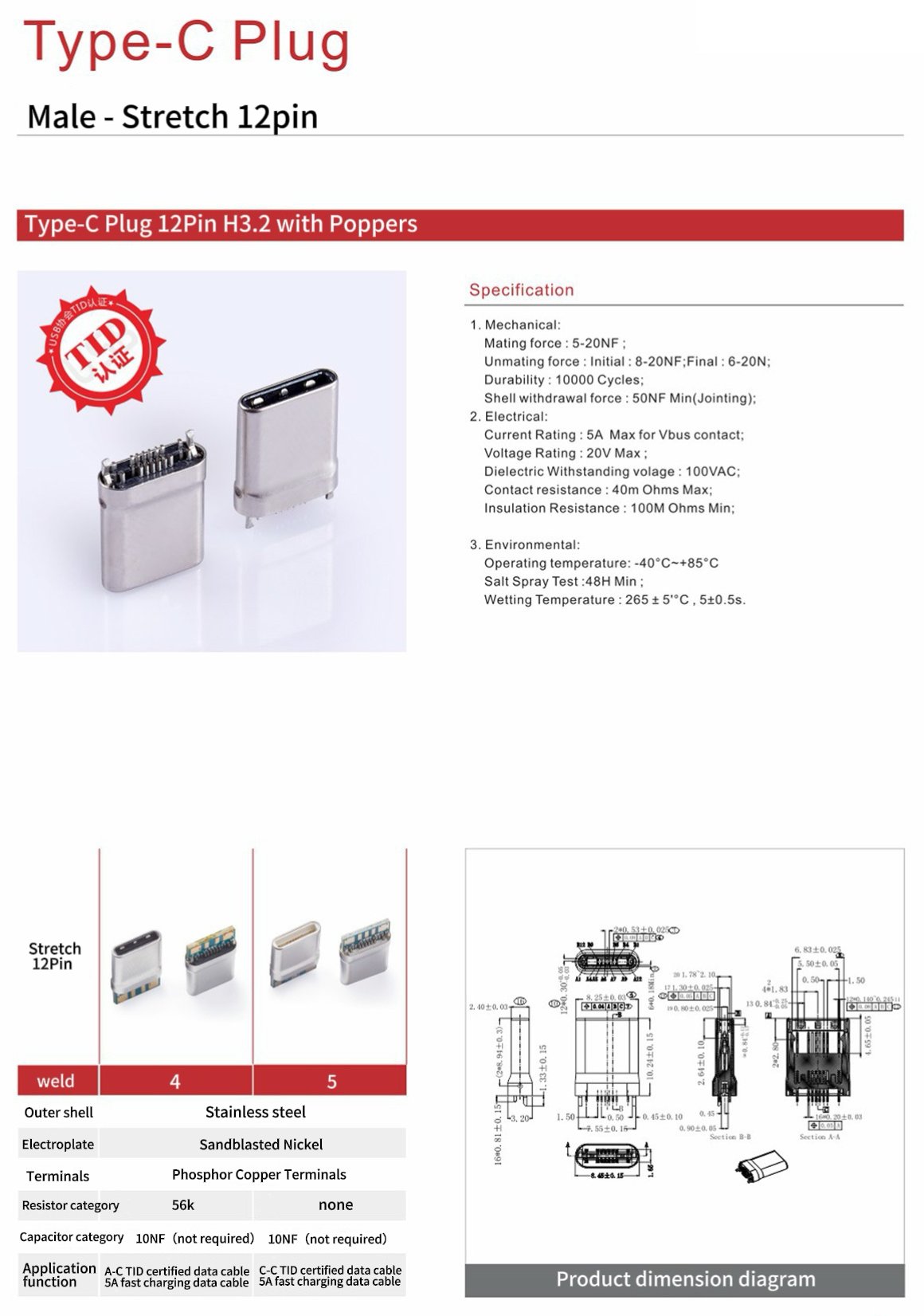 Type-C Plug Stretch 12Pin Step 3.2 (TID Certified)